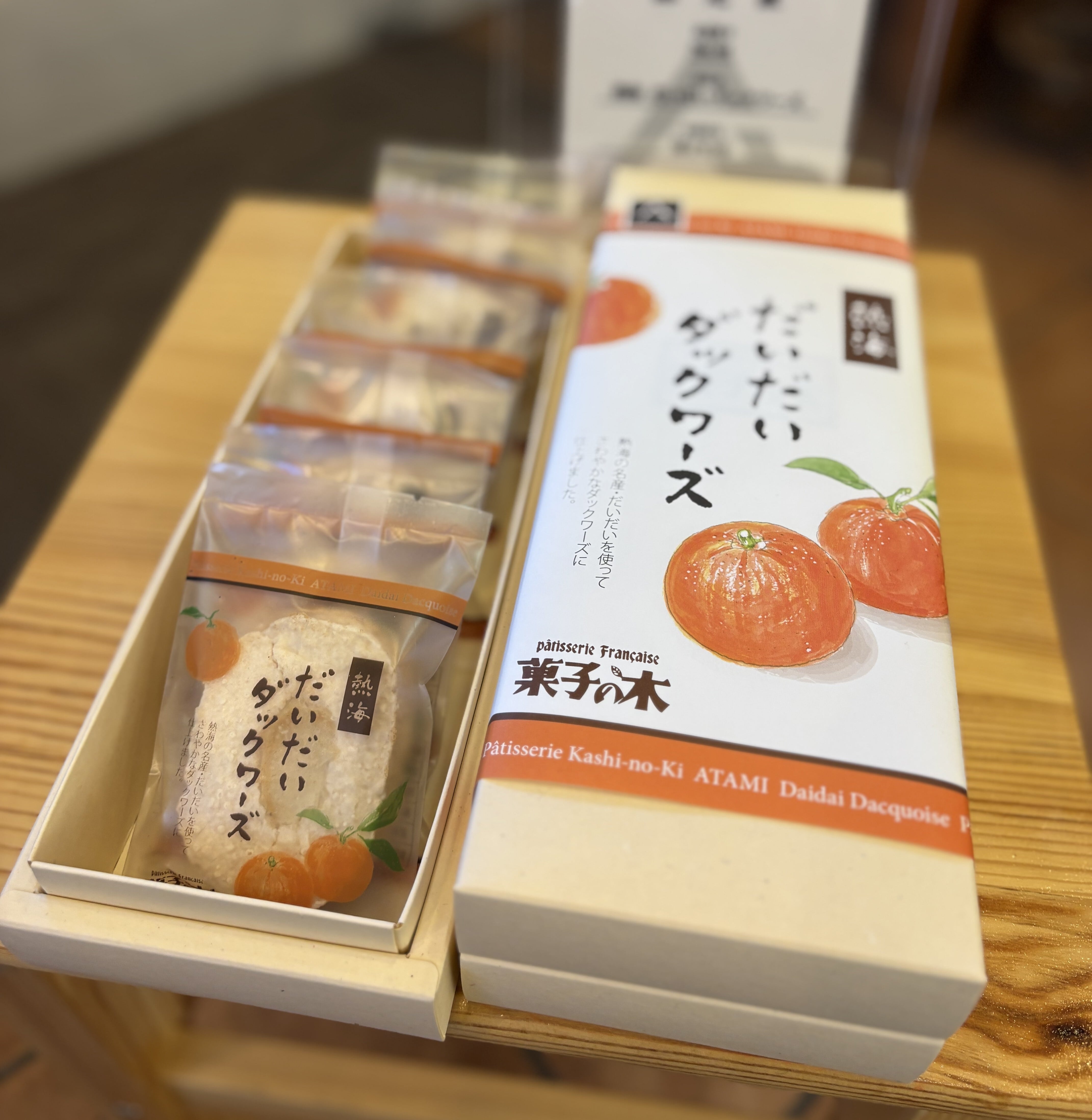 だいだいのマーマレードをダックワーズのクリームに使用することでだいだいダックワーズが出来上がりました。だいだいの少しほろ苦さが、菓子の木の美味しいバタークリームと調和して口の中で温かみのある優しさが広がります。